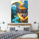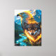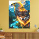 - Below, a **wolf with glowing amber eyes** radiates strength and primal energy. Flames encircle its neck and chest, forming a fiery pattern that conveys elemental power.