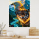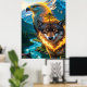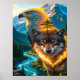 - Below, a **wolf with glowing amber eyes** radiates strength and primal energy. Flames encircle its neck and chest, forming a fiery pattern that conveys elemental power.