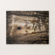 Wolf face blended into woodland trees and a sunshine ray or beam for a spirit or totem wolf image jigsaw puzzle