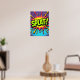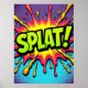This dynamic poster captures a moment of pure, messy fun in a retro comic style. The artwork explodes with a burst of colour, as the word "SPLAT!" is brought to life with bold, dripping letters that look like a glorious paint fight frozen in time. The vibrant lime green text and surrounding neon pink, yellow, and blue splashes create an energetic, chaotic vibe that's impossible to ignore. Juxtaposed with the clean lines of the comic starbursts and the vintage halftone dot background, this piece is a playful tribute to classic comic book sound effects. It's special because it's a bold and loud statement piece that turns a simple word into a visually exciting event, perfect for adding a touch of rebellious fun and pop art energy to any space.