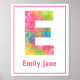 Cute print for nursery or kid's room features multi-coloured splatter paint letter E with customizable pink text and a thin pink border frame.