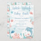 Sweet Splish Splash Baby Bash ocean animals baby shower invitation. Design done in watercolors with underwater seashells, fish, bubbles and other cute animals. A perfect baby shower invite for either a baby boy or girl.