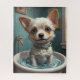 Adorable pets sitting in a bathtub, with water droplets and bubbles around it. The puppy looks at the viewer with wide, innocent eyes, and its little paws rest on the edge of the tub. The overall atmosphere is cute and humorous, making it ideal for a poster set.