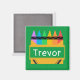 Bold and colourful personalized magnet for kids is great for playrooms and homeschooling areas. Design features a split crayon box with room to personalize with child's name in centre, on green background.