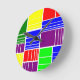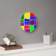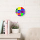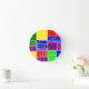 This wall clock has a Bauhaus design of rectangles divided into ever smaller pieces in red, yellow, blue, green, purple on a field of white.