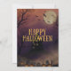 Elegant and spooky Halloween party invitation featuring a gothic haunted mansion under the full moon with flying bats, an eerie graveyard, and dark, misty skies. Perfect for Halloween events, costume parties, or gothic-themed celebrations.