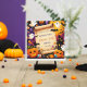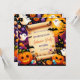 The design features an aged parchment scroll at the centre, providing a blank space for text. Surrounding the scroll are various Halloween-themed icons, including smiling jack-o’-lanterns, ghosts with different expressions, candy corn, Halloween-coloured lollipops, black spiders, and bats. The background is a deep purple with subtle star patterns, creating a playful and spooky atmosphere perfect for a Halloween invitation.