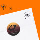 Halloween black, red and orange sticker features three flying silhouette bats with scary eyes and "thank you for a scary time" and the child's name in modern typography.