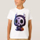 This collectable figure combines elements of spookiness and cuteness. It features a stylized skeleton with an oversized head, wearing a black cloak with horns. The figure has large, hollow eyes and a white skull-like face with a melting effect. , it holds a small orange pumpkin basket, reminiscent of Halloween trick-or-treating.