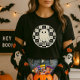Sweet meets spooky — a cheerful ghost sits over a checkboard pattern with “Spooky Cute” styling. Perfect for lovers of gentle Halloween vibes, aesthetic fashion, or seasonal flair.