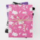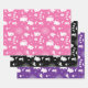 Cute set of three wrapping paper sheets featuring an adorable Halloween ghost pattern . One is pink , one is black and one is purple .