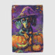 Embrace the Halloween spirit with this enchanting design featuring a cute dog in a witch hat surrounded by carved pumpkins. Perfect for adding a touch of spooky charm to your festive celebrations.