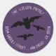 Spooky purple Halloween envelope seals featuring three flying bats . Personalize them with your family's name and address using the appropriate template fields .