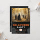 Prepare for a spook-tacular event with this Halloween party invitation, perfect for setting an eerie yet exciting tone. The top half of the invitation showcases a hauntingly atmospheric scene of shadowy figures in cloaks roaming through a dark, dense forest. The chilling backdrop of twisted trees and creeping mist adds an extra layer of mystery and allure.