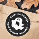 Round Halloween stickers featuring a spooky, white ghost and customizable text "Happy Halloween" and your name. White text on a black or custom colour background.