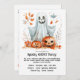 This Halloween party invitation features a delightful and whimsical design with a playful touch. At the centre, a friendly, smiling white ghost drifts cheerfully with outstretched arms, adding a touch of charm to the scene. Flanking the ghost are two cute, grinning pumpkins, each with a happy face that enhances the festive, lighthearted vibe. The illustrations are rendered in a soft watercolor style, giving the design a gentle and inviting feel.