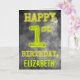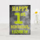 The front of this mysterious looking, personalized birthday-themed greeting card design features the message "HAPPY 1st BIRTHDAY" with characters having an eerie glowing aura appearance, on a spooky grey cloudy mist-inspired background pattern. The front also features an editable recipient name. The inside features a personalized birthday greeting message. A customized birthday greeting card like this might be used to send a birthday greeting message to somebody celebrating their 1st birthday. [~Z0000364]