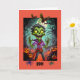 A spooky green zombie in chains surrounded by bats, scary jack O 'Lanterns, and spiders is the feature design on the front cover with the word, "BOO!" On the inside left is a spider web with spiders against a black background. On the right inside page is the message, "Have a spooky Halloween." Enjoy this scary card. Think of the clever ways to personalize it. This would also be a great card design for invitations to your next Halloween Party.