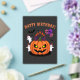 Cartoon pumpkin birthday cake with skull balloons, ghosts in party hats, creepy candles, and bats for a spooky Halloween birthday.