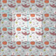 This design is a Halloween-themed pattern with a whimsical and playful design. The background colour is a soft pastel blue, and it is filled with various Halloween icons and symbols.