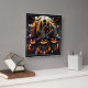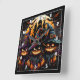 Three colourful scarecrows with glowing pumpkin heads theatrically display eerie charm, set against a haunted castle silhouette and a full moon.