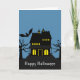 Éffrayant Haunted House Halloween Carte de voeux avec une maison hantée nichée entre deux vieux arbres et des lances et une chauve-souris solitaire volant au premier plan. Cette carte cool est un choix idéal pour souhaiter une Halloween joyeuse à un ami ou à un membre de la famille ! Si facile à customiser, ajoutez simplement le texte personnalisé de votre choix. Cliquez sur le bouton "Customiser" pour plus d'options de personnalisation.