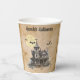 Spooky Haunted House Halloween Party Paper Cups. This design showcases a haunting scene on the front, with a dilapidated, Gothic-style mansion standing ominously against a dark, cloudy sky. A large, eerie full moon glows behind the house, casting a ghostly light that highlights the weathered bricks and broken windows. Bats are silhouetted as they swoop across the moon, adding to the spooky atmosphere.