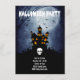Two-sided enclosure care / invitation with a black haunted house, a skull, and ghost on a spooky blue moonlit evening. White "Halloween Party" text is on the front. Customize and personalize the party details on the front. The back shows the ghost and bats. This card is spooky, ethereal, creepy, and cool. Pair it with its matching blue envelope.