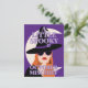 Lighthearted, mischievous, Halloween postcard has a typography design with playful wording "A Little Spooky October Mischief" with a modern and fashionable red headed witch and a crescent moon on a purple background.