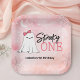 This 1st birthday party paper plate is perfect for a Halloween birthday party. This girly design features a graphic of a ghost wearing a pink bow, and is accented with the text "Spooky ONE".