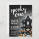 Available as a printed card or a downloadable digital card you can email or print locally. Cute Spooky One First Halloween Haunted House Themed 1st Birthday Party Invitation with Ghosts, Bats, and Distressed Style.
