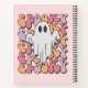 This fun and festive Halloween design features a classic ghost illustration front and centre, surrounded by the word "Spooky" repeated in a bold, bubbly font. The text is layered in vibrant, retro-inspired colours like soft pinks, purples, and oranges, creating a playful contrast against the ghost's simple white figure. The ghost's expressionless black eyes add a touch of eerie charm, while the wavy, stacked typography gives the design a groovy, nostalgic feel.