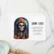 Thank you card with an illustration of a skeleton wearing a hooded jacket with an orange witch's hat on top. Surrounded by cute and spooky pumpkins. A glowing moon in the back with a single bat flying nearby. Fun autumn Halloween design or for death themed gifts parties or business.