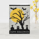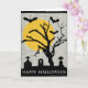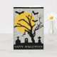 A silhouette of a tree and tombstones over a newsprint background decorate the front of this card.
