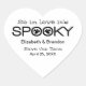 Fun and quirky Spooky Typography Halloween Save the Date Stickers in white and black featuring a fun text design of the word "spooky" with a pair of charming ghosts haunting the two "O" letters. This chic design is perfect for announcing your wedding date around or on Halloween. Easy to customize, simply add the details of you wedding in the text fields provided. For more customization options, click on the "Customize It" button to change fonts, text colours or move the design element.