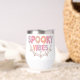 This fun and festive Halloween design features the phrase "Spooky Vibes" in a playful, dripping font that gives the text a gooey, eerie effect. The words are filled with soft, pastel shades of pink, orange, purple, and peach, adding a lighthearted and whimsical twist to the spooky theme. Beneath the text, a simple spider web illustration in a soft brown colour adds a classic Halloween touch, tying the design together. The combination of the pastel colours and the spooky elements creates a unique contrast that’s both cute and a little bit creepy, making it perfect for Halloween