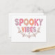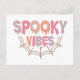 This fun and festive Halloween design features the phrase "Spooky Vibes" in a playful, dripping font that gives the text a gooey, eerie effect. The words are filled with soft, pastel shades of pink, orange, purple, and peach, adding a lighthearted and whimsical twist to the spooky theme. Beneath the text, a simple spider web illustration in a soft brown colour adds a classic Halloween touch, tying the design together. The combination of the pastel colours and the spooky elements creates a unique contrast that’s both cute and a little bit creepy, making it perfect for Halloween