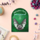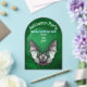 This Frosted acrylic Halloween Party invitation has a spooky white and pale green bat with outstretched wings in front of a creepy cave with trees that is glowing green. Customise all the text with the templates.