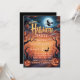 Set against a dramatic twilight sky, the scene is framed by gnarled, spooky trees and a haunted forest, creating a perfectly eerie atmosphere. Glowing jack-o'-lanterns rest at the bottom, casting a warm and mischievous light. The vintage-style typography is fully customizable for your event details.