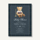 At the top, a delightful teddy bear dressed in a luxury blue outfit sets the tone with classic preppy flair. Just below, the heading Baby Shower is beautifully written in elegant calligraphy, adding a graceful, refined touch that perfectly complements the theme. The event details are displayed in a sophisticated serif font, creating a harmonious balance between tradition and modern elegance.