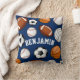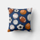 A navy throw pillow featuring an assortment of sports balls and a spot for your gift recipient's name centred within them.