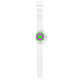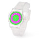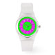 Fashionable analogue watch in green and magenta, white numbers with black shadow, sporty pink strap. You can also choose a white strap. This watch is water-resistant to 30 metres, a stylish wardrobe accessory or tough but classy work watch, and even keeps the time.
