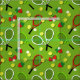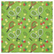 Sports themed patterned fabric featuring tennis racquets, tennis balls and summer strawberries over a grass green background