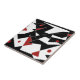 Various white and red geometric shapes are scattered across a black background, creating a stark contrast. Some shapes are interconnected with thin white lines, and red dots add a pop of color to the composition.