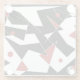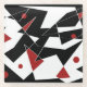 Various white and red geometric shapes are scattered across a black background, creating a stark contrast. Some shapes are interconnected with thin white lines, and red dots add a pop of color to the composition.