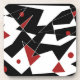 Various white and red geometric shapes are scattered across a black background, creating a stark contrast. Some shapes are interconnected with thin white lines, and red dots add a pop of color to the composition.