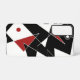 Various white and red geometric shapes are scattered across a black background, creating a stark contrast. Some shapes are interconnected with thin white lines, and red dots add a pop of color to the composition.
