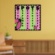 Poster with polka dots of white on lime and pink, cute pink spotted ladybugs, and text quote with the letters SPOTS.