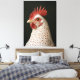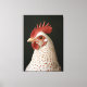 A hyper-realistic portrait of a spotted chicken with red and white feathers, detailed comb and wattles, set against a dark background.