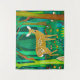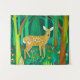 Tapestry in a stylized illustration of a cute, spotted fawn in a fairytale forest setting, surrounded by trees and plants, in shades of brown and green